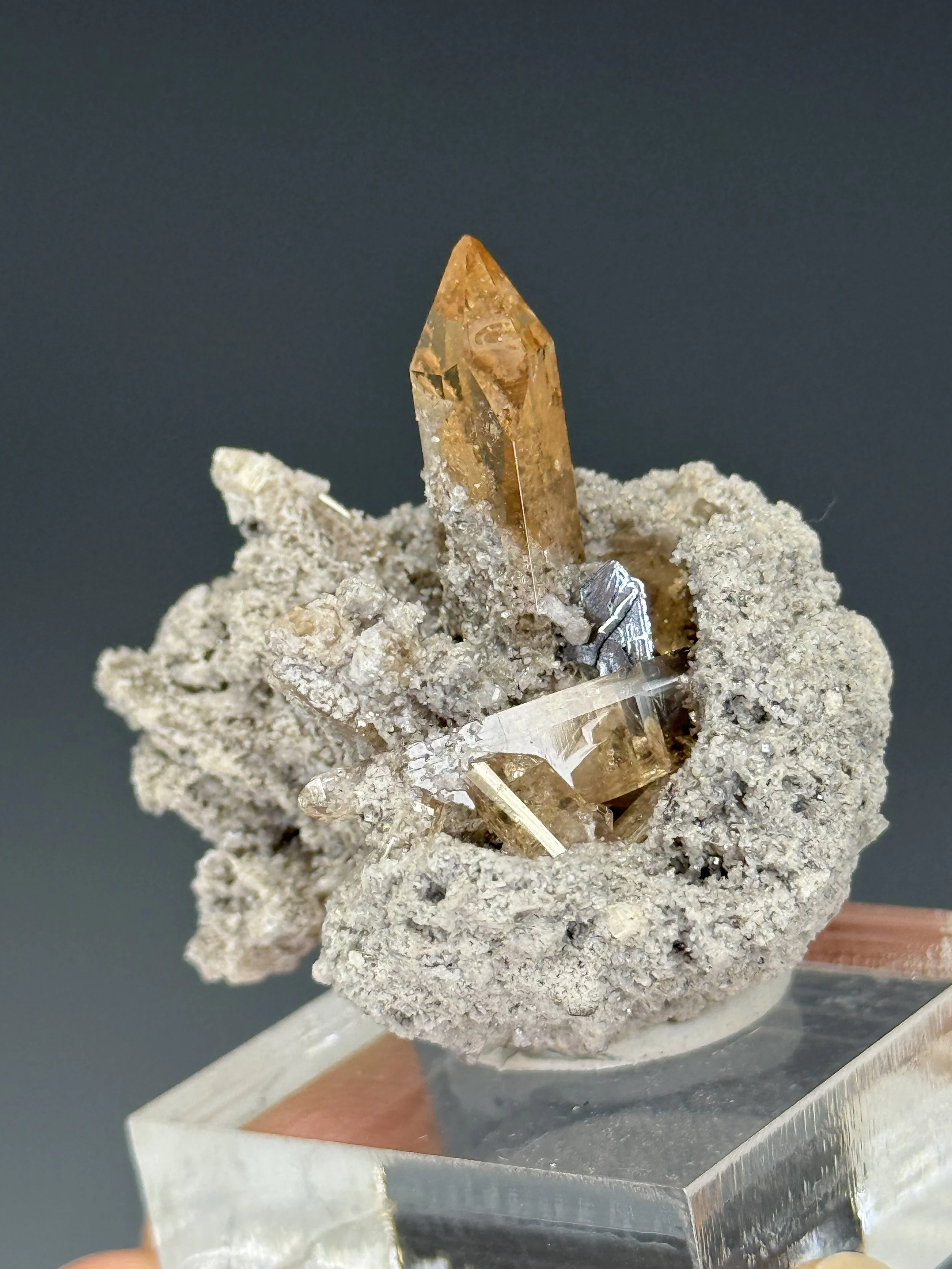 Description: A single crystal from the “Sugar Bowl Pocket” find at the Murray Mine. This material was nicknamed the “sugar bowl” due to the druzy quartz coating the blocky baryte crystals. The display face is in great condition, with the backside and bottom being contacted. This specimen is from the personal collection of Casey Jones who held the commercial specimen collecting contract for the Murray Mine when this find was made.