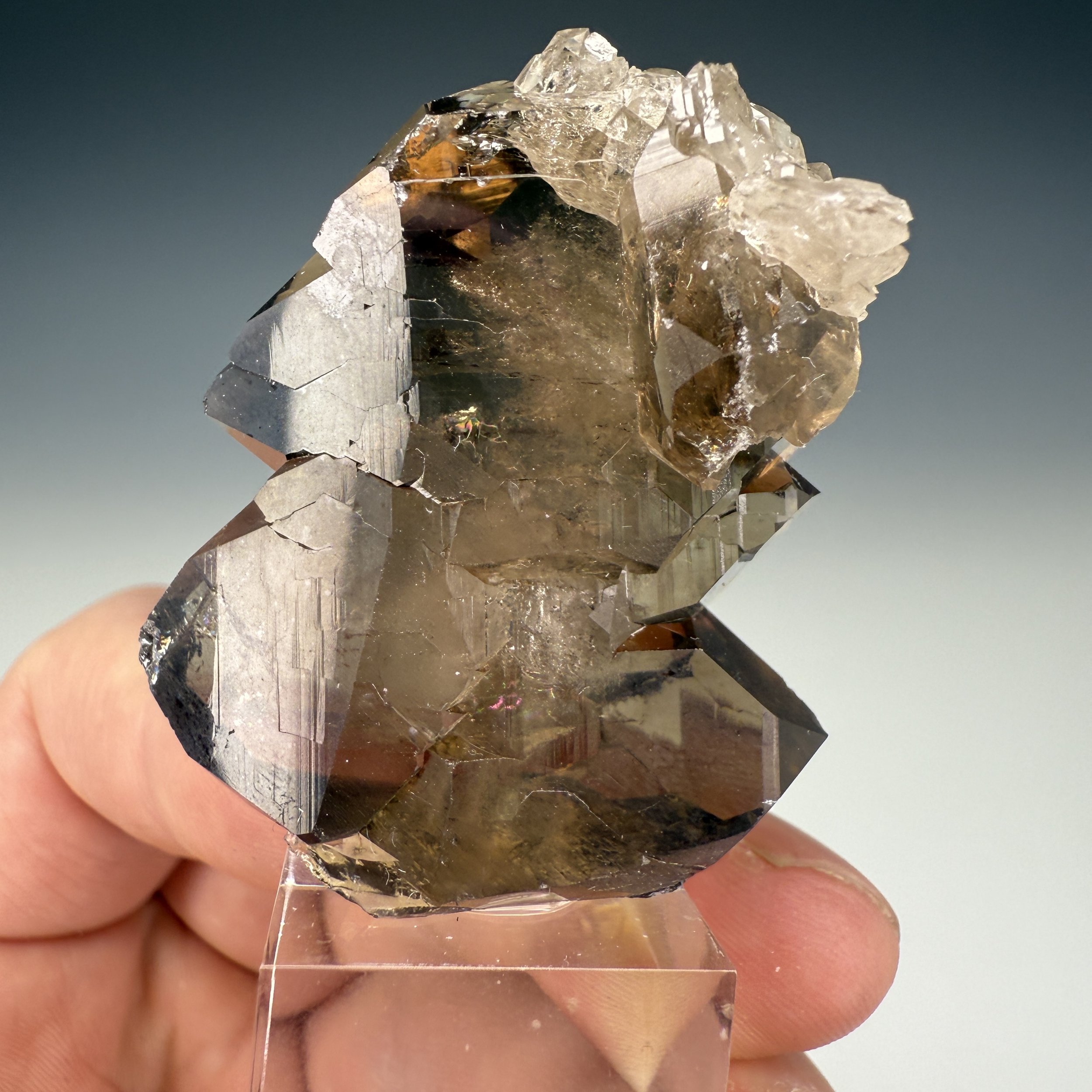 Description: A smoky twinned cerussite cluster on a glittering white dolomite matrix. Lustrous, with sharp edges and nice presentation.