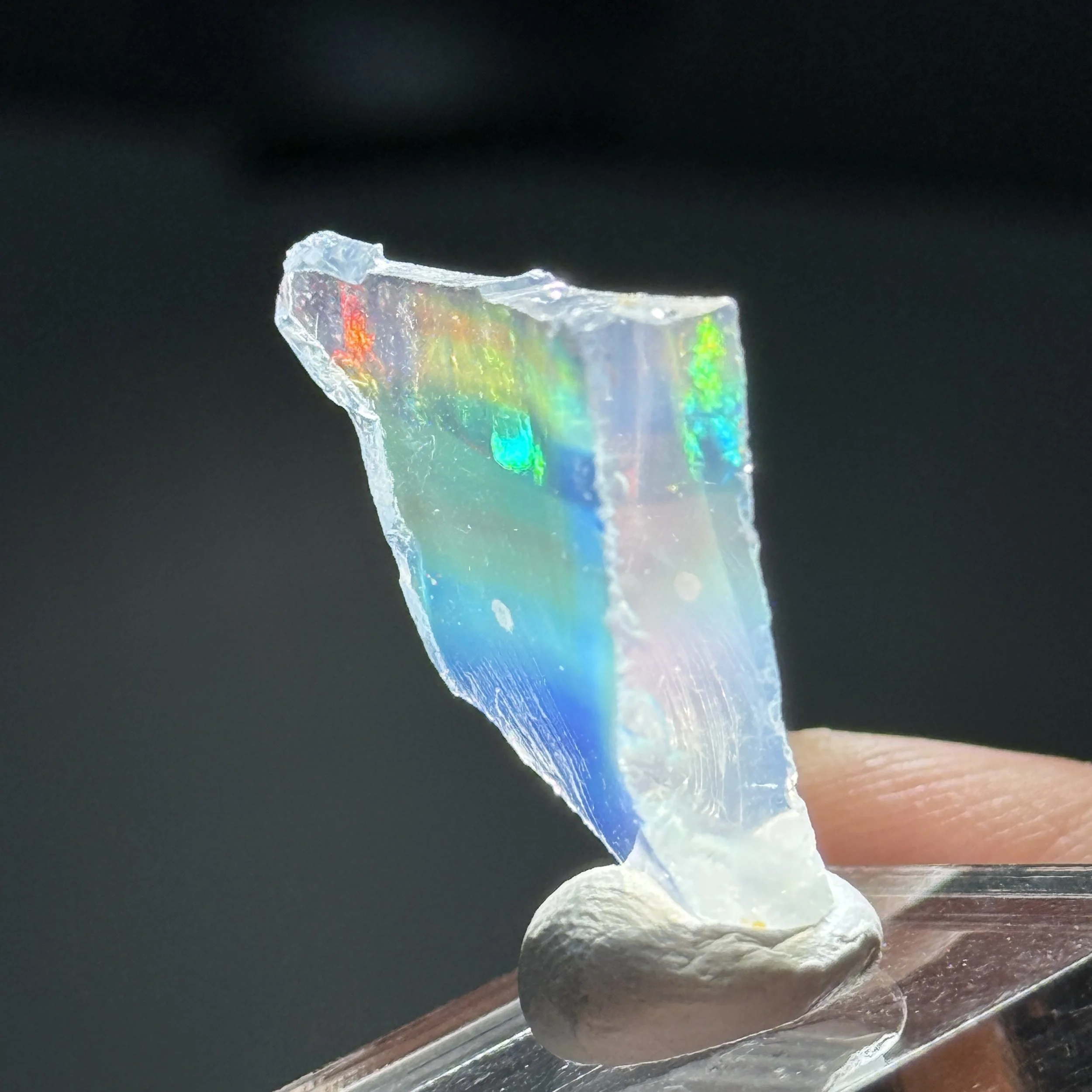 Description: A gemmy example of Oregon opal with nice fire. Flashes of color can be seen better under direct light rather than backlight on this specimen. Slight crazing is apparent. Contra luz opals from Opal Butte are some of the best American opals to ever come to the market. Contra luz is Spanish and means to view against the light. This is because the material appears translucent and jelly like until it is held up to the sun or in front of an artificial light source. Then the astonishing play of fire can be seen in these specimens. The material was produced in the late 1980s and 1990s and is no longer being mined today. Even when it was being mined contra luz was highly sought after and coveted. Part of the reason for this is its inherent beauty, and part of the reason is that only a small amount of it was ever found. An entire season of machine mining would yield around 100kg of opal according to Kevin Lane Smith 1989. This 100kg includes all the varieties found at the mine; blue opal, fire opal, hyalite opal, rainbow opal, hydrophane opal, crystal opal, and contra luz opal. Of that material 5% was contra luz and only 70% of the material found was stable. So that means 3.5kg per year of contra luz was found. Even rarer than this is the crystal contra luz opal which only constituted 1% of the material found and 80% was stable so only 800 grams per year were produced. Ex. Thomas Harth Ames