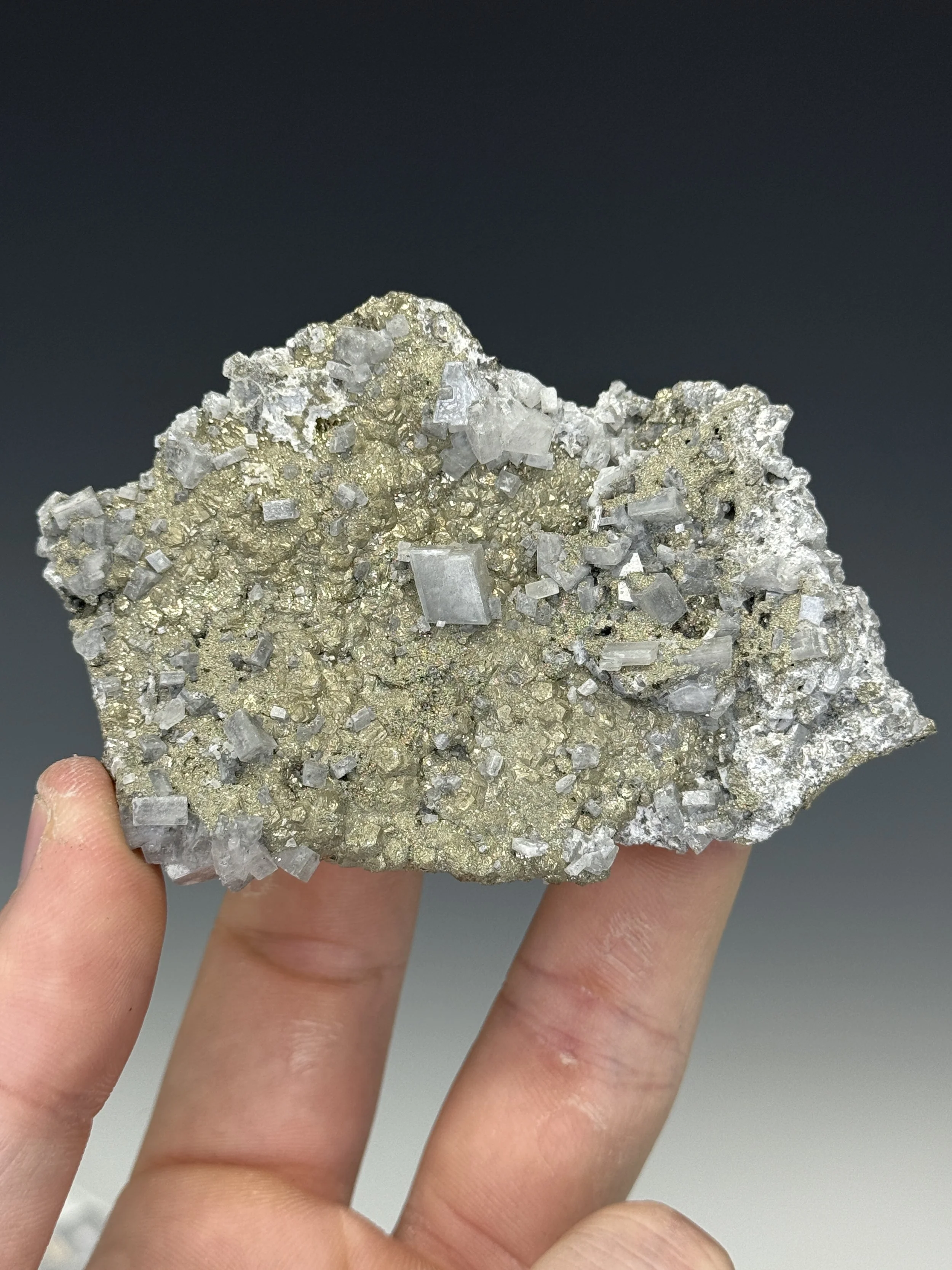 Description: Many pyrites have come from Huanzala over the years. However, this piece is of exceptional quality. The mirror luster sharp cubes are covered by a contrasting second generation of pyrite that both has a different coloration and a differing texture. This is further layered on by a growth of sphalerite which is mirror black. A really pleasing aesthetic example of the beauty of sulfide minerals.